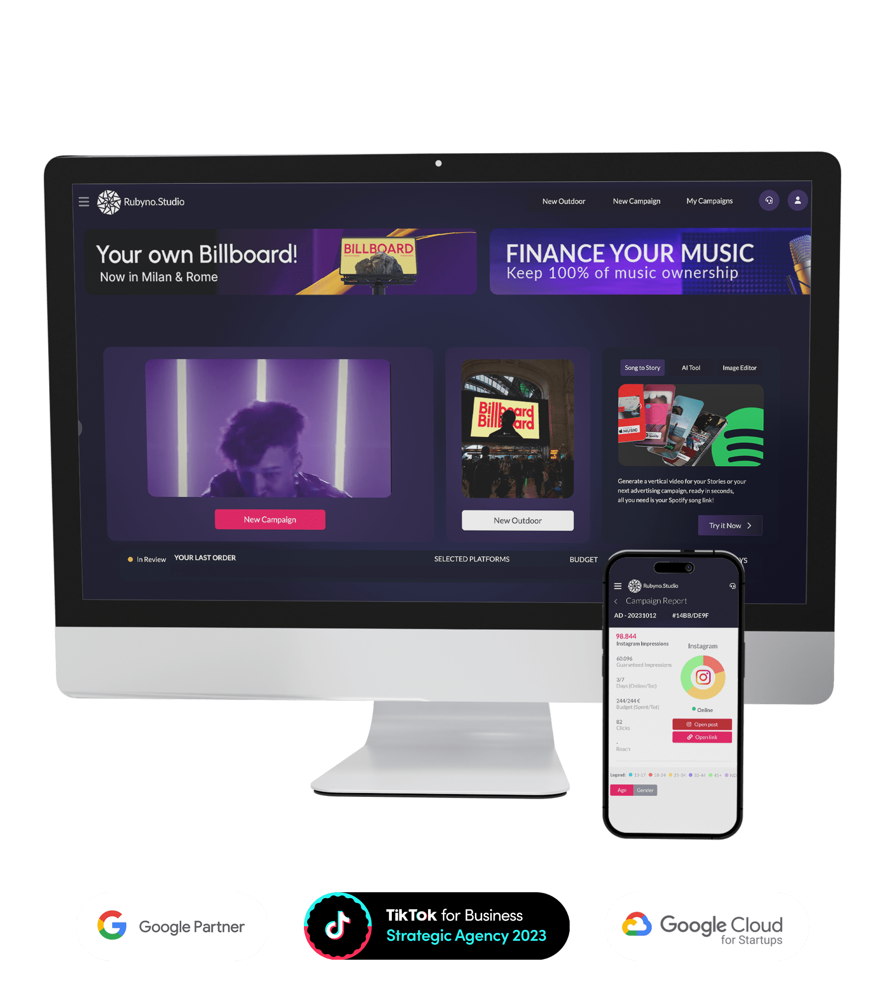 With Rubyno.Studio you can choose to promote yourself through Facebook Ads, Instagram Ads, Google Ads, YouTube Ads, TikTok Ads, Spotify Ads, Snapchat Ads.