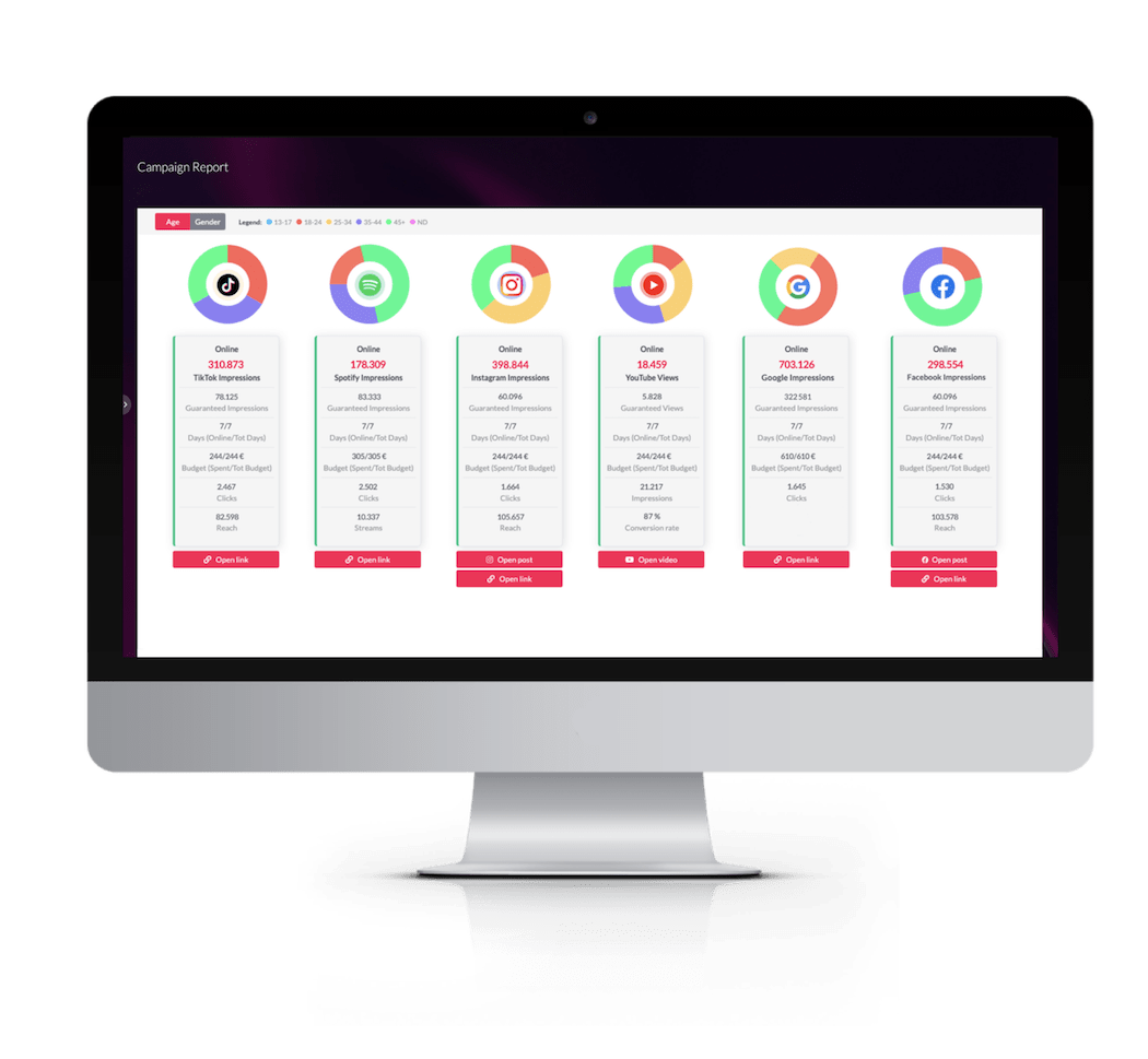 You may monitor your advertising campaigns in real time directly from Rubyno.Studio and get details such as: people reached, impressions, clicks, video views, streams, followers and more. Learn more about your audience with charts divided by age and gender.